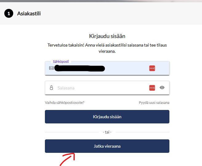 Kyllä, voit tilata rekisteröitymättä tai kirjautumatta olemassa olevalle asiakastilillesi, kun painat kassalla sähköpostiosoitteen syötettyäsi painiketta "Jatka vieraana".