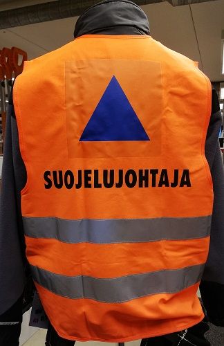 Huomioliivin rinnuksissa on tuotekuvan mukaisesti kansainvälinen VSS-tunnus (sininen kolmio oranssilla taustalla), sekä teksti "SUOJELUJOHTAJA".
