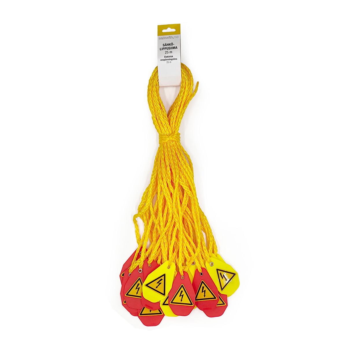 Punottu muoviköysi, jossa tukevat sähköalan heijastimet. Turvallisuuden parantamiseen esimerkiksi työmaiden sähkötyöalueiden rajauksessa.